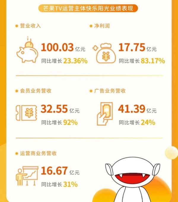 先说说营收。财报中披露了芒果TV几个主要板块的收入情况,报告期内,会员收入达32.55亿元,同比增长92%;广告收入达41.39亿元,同比增长24%;运营商收入达16.67亿元,同比增长31%。