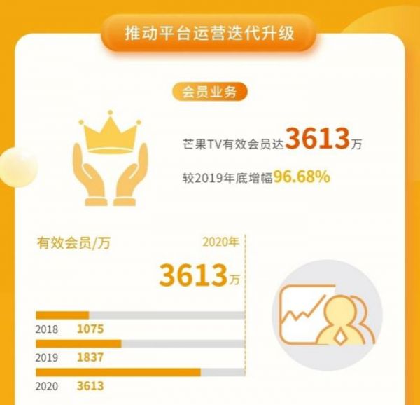 2020年末,芒果TV有效会员数达3613万,较2019年末增长96.68%。