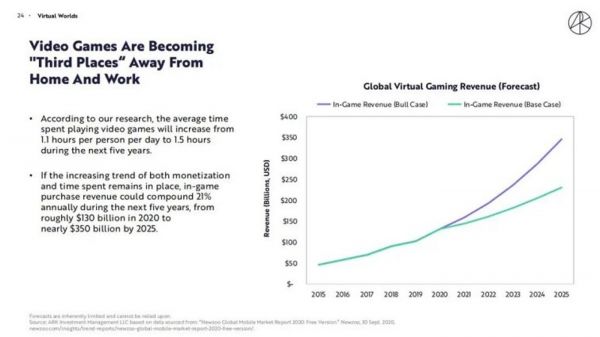 除了上面的因素之外,还有一个点或许是因为ARK看好游戏行业。此前,美国投资机构ARK Invest在年度报告中认为,未来5年内,人们玩游戏的时间将从每人每天1.1小时增长到了1.5小时。在过去10年中,游戏内部购买占游戏总收益的比例从20%上升到75%。到2025年,这一比例将达到95%。