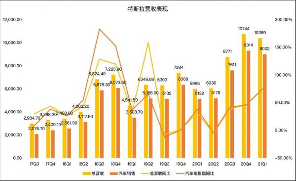 特斯拉第一季度总营收为103.89亿美元,与去年同期的59.85亿美元相比增长74%,略低于彭博分析师一致预期的104.14美元。