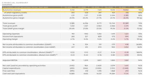财报显示,特斯拉第一季度总营收为103.89亿美元,与去年同期的59.85亿美元相比增长74%,略低于彭博分析师一致预期的104.14美元,归属于普通股股东的GAAP净利润为4.38亿美元,与去年同期为6800万美元相比,创下史上最高季度盈利纪录,连续七个季度实现正盈利。归属于普通股股东的每股摊薄收益为0.39美元,与去年同期的0.02美元相比增长1850%。