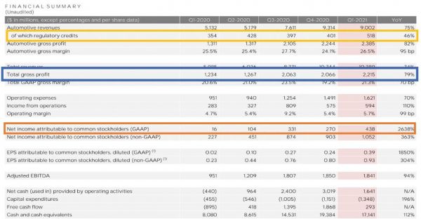 在1季度,碳积分部分的收入高达5.18亿美元,过去的一年特斯拉依靠碳积分部分收入实现多个季度盈利,扭转了一年前的亏损状态。去年2,3,4季度碳积分部分的收入贡献在4亿左右,没想到今年1季度这部分收入更是攀升到5.18亿。再看看同期的GAAP净利润只有4.38亿美元。素来以“毒舌”著称的金融博客Zerohedge嘲讽称这是一种纯粹的会计手段,特斯拉所有净利润都来自环境监管信用(regulatory credits)销售。
