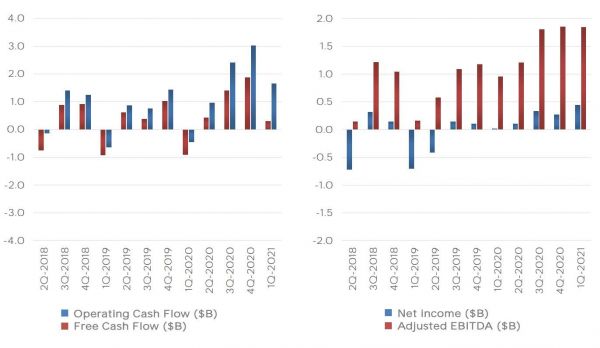除了碳积分之外,最引人关注的就是特斯拉的比特币收入,特斯拉在今年2月购买了15亿美元的比特币,后者在今年涨势如虹,仅1季度,比特币价格就达到了翻倍。特斯拉在高点出售了2.72亿比特币资产,带来了1.01亿美元收入,进一步推动了特斯拉的净利增长。