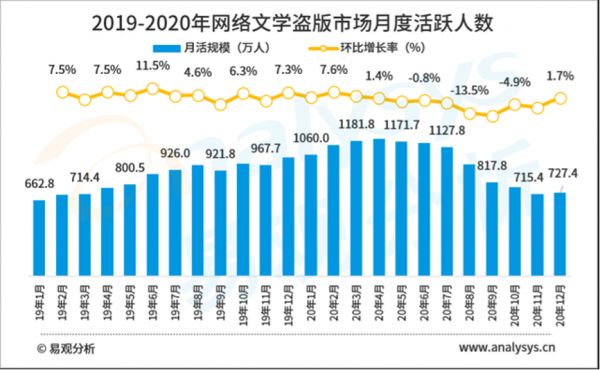 根据易观分析最近发布的《中国网络文学版权保护白皮书》显示,截至2020年12月,整体市场规模288.4亿元,盗版损失规模达60.28亿元,同比上升6.9%。