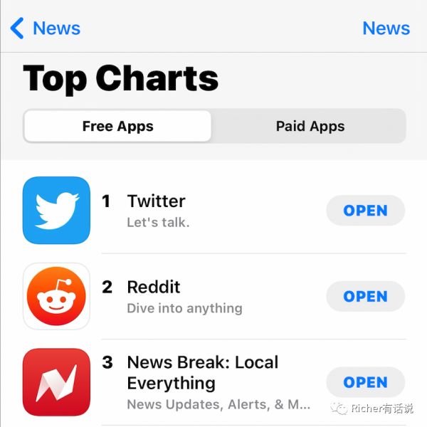 在载体之外,我认为更为重要的革命要来自于媒体的交互方式上。上文提到的内容经济独立站趋势是一个点。另外,这两年在刷榜的过程中不少人有一个发现,从2019年起,在美国IOS APP榜首的News应用发生了很多变化,今天竟然是Twitter、Reddit和Newsbreak。一个是传统的微博模式、一个是社区模式、一个是新闻聚合模式。我想这背后所在的意义也呼之欲出。大家长久以来已经不满足传统“记者报道”的模式,展开了大量信息交互方式的探索。简而言之,在过去和现在是“记者写什么我们读什么”,“AI给我们推荐什么我们看什么”,而未来是,“我想看什么,内容创作者就去创作什么”,按需创作的生态。