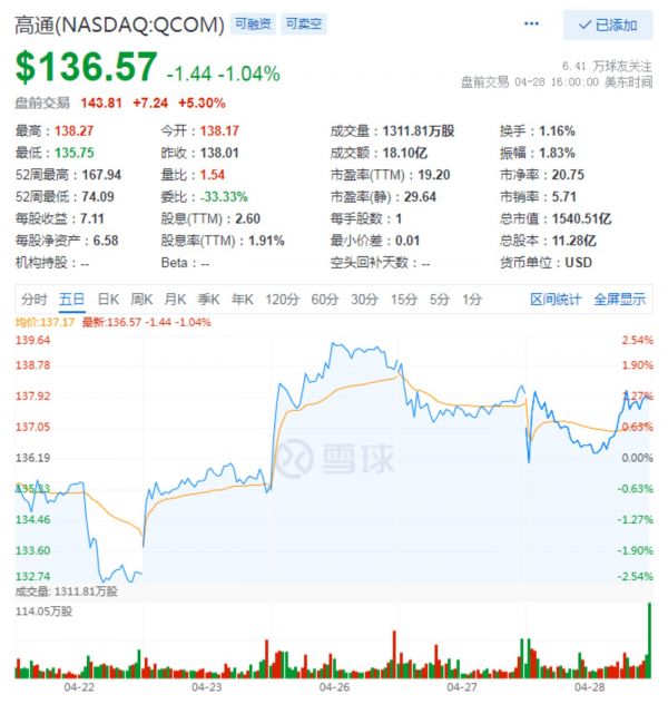 因高通第二财季业绩超出市场预期,对下一财季业绩的展望也给出了营业收入为71亿美元-79亿美元的乐观指引,进而推动了其盘后股价上涨超5%。