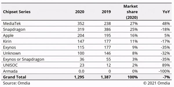 然而,根据市场调研机构Omdia发布的数据,联发科2020年手机芯片出货量3.52亿枚,暴涨48%,市场份额增加到了27%。力压高通成为全球最大的智能手机芯片供应商!高通2020年智能手机芯片出货量3.19亿枚,同比下降18%,市场份额25%。
