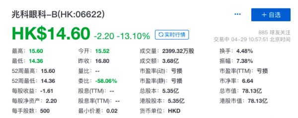 截至发稿前,兆科眼科的股价跌至每股14.6港元,跌幅达13.1%,总市值78.13亿港元。