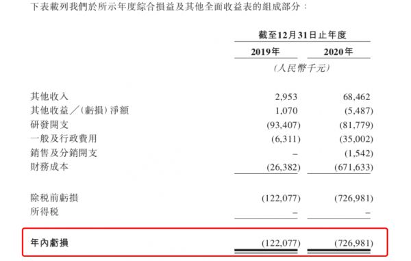 招股书显示,截至2019年及2020年12月31日止年度,公司并无盈利并产生经营亏损,亏损净额为人民币1.221亿元及人民币7.27亿元。