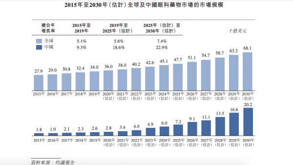 兆科眼科的招股书显示,中国眼科药物的市场规模由2015年的18亿美元增长至2019年的26亿美元,预计由2019年按复合年增长率18.6%进一步增长至2025年的72亿美元,由2025年按复合年增长率22.9%增长至2030年的202亿美元,超过同期全球眼科药物市场的增长。