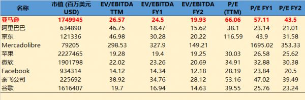 此外,由于亚马逊有大量的折旧,其过去12个月的息税折摊前利润(EBITDA)达到了591亿元,超过净利润2倍有余。所以,如果以企业价值倍数(EV/EBITDA)来计算,亚马逊当前只有26.5倍(TTM),这一水平远低于京东、阿里巴巴等中国的电商公司,并预期在两个财年内降到20倍以内。苹果目前也有20倍的企业价值倍数,预期在两个财年内保持相同水平。