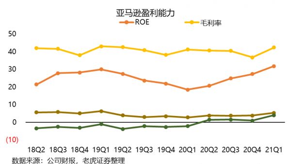 疫情催生的网购需求,使得亚马逊成为居家隔离措施的主要受益者之一。以美国疫情最严重的20年Q2为例,亚马逊的收入同比增长40.2%,其后两个季度的增速也保持在37.4%和43.6%。令人惊讶的是,后疫情时代21年Q1的收入更是创下了43.8%的记录。
