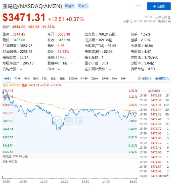 或许是受益于疫情带来的强劲需求,强者恒强的亚马逊Q1业绩非常出色。公布财报后,亚马逊盘后一度大涨4%突破3600美元创历史新高,最终收窄至2.38%。