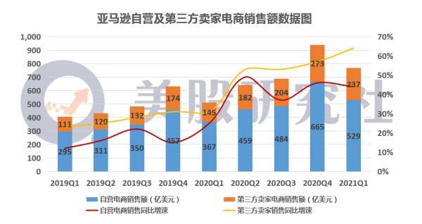 按业务划分来看,拥有大量忠实消费者和第三方卖家的亚马逊,Q1来自在线零售的净销售额为529亿美元,同比增44%,高于市场预期的515亿美元;来自第三方卖家服务的净销售额为237亿美元,同比增64%,高于预期的217亿美元。