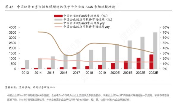 2、2019年国内SaaS规模是2000亿左右,2020年SaaS规模增长到2500亿,环比增速达25%。根据艾瑞数据统计,传统企业和公共领域云服务规模2024年预计将达到3500亿规模。国内消费市场宏观经济从高速增长进入平稳增长阶段、人口红利逐步消失&劳动力成本加速上行等,同时叠加政策、法律等层面系列利好因素的支撑导致SaaS服务商与时巨增。