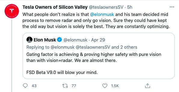 至于担心摄像头能否提供与雷达相同的安全水平,以检测前方几辆汽车正在发生的事情,马斯克指出,视力同样有很好的可能性。