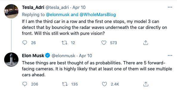 「最好将这些东西视为概率。有5个前置摄像头。他们中至少有一个很可能会看到前面的很多辆汽车。」