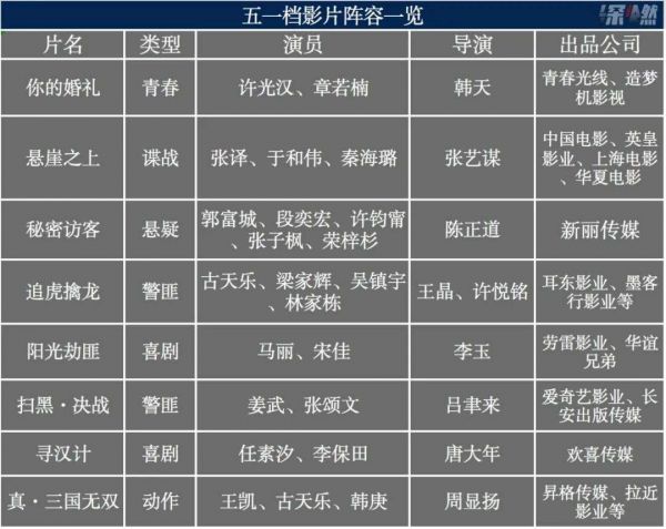 先来看看最挤五一档的选手都有谁。11部影片,有悬疑、青春、谍战、喜剧、港片、动画,几乎囊括各个类型,但真正能打的不算多。