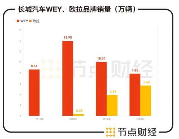 欧拉2020年、2019年销量分别5.65万辆、3.89万辆,同比增长44.76%和1005.69%。虽然增速较快,但体量偏小,尚不能对长城汽车的业绩起到支撑作用。