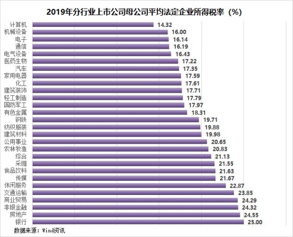 虽然我们国家大部分企业属于25%税率档,但国家还是给了很多的优惠,尤其是上市公司优惠更多。分行业看,隶属于制造业和鼓励行业的计算机、机械设备、电子、通信、电气设备等,平均法定税率都不高,其中计算机行业平均只有14.32%,高科技含量最高。