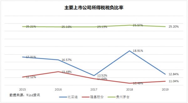 如上图,我们选取了A股3家代表性的上市公司,计算出了从2015到2019年共5年的上市公司所得税税负比率,其中比亚迪和贵州茅台法定的所得税税率是25%,隆基股份由于属于高科技行业,法定税率是15%。