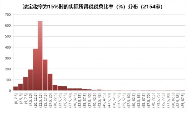 上图是法定税率为15%时的所得税税负比率分布,占比最高的是12.5%-15%之间,全部2154家上市公司,中位数为13.49%。