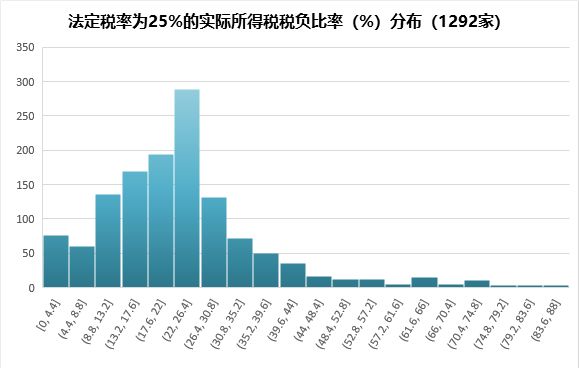 上图是法定税率为25%时,上市公司所得税税负比率的分布。频率分布上属于左偏,在22%-26.4%区间的占比最高,全部1292家上市公司的中位数为22.29%,低于法定的25%税率。