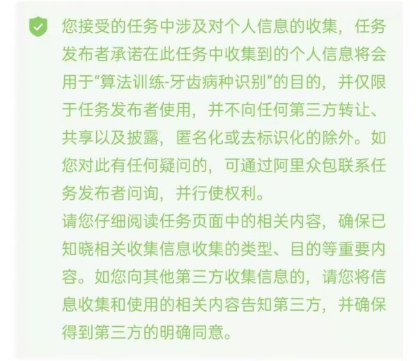 “能知道的只有他(平台)告诉我的。具体数据去哪了,用于什么了,没有去深究。”周舟只知道平台告知的信息,在阿里众包的一个任务中显示,您接受的任务中涉及对个人信息的收集,任务发布者承诺在此任务中收集到的个人信息将会用于“算法训练——牙齿病种识别”的目的,并仅限于任务发布者使用,并不向任何第三方转让、共享以及披露,匿名化或去标识化的除外。