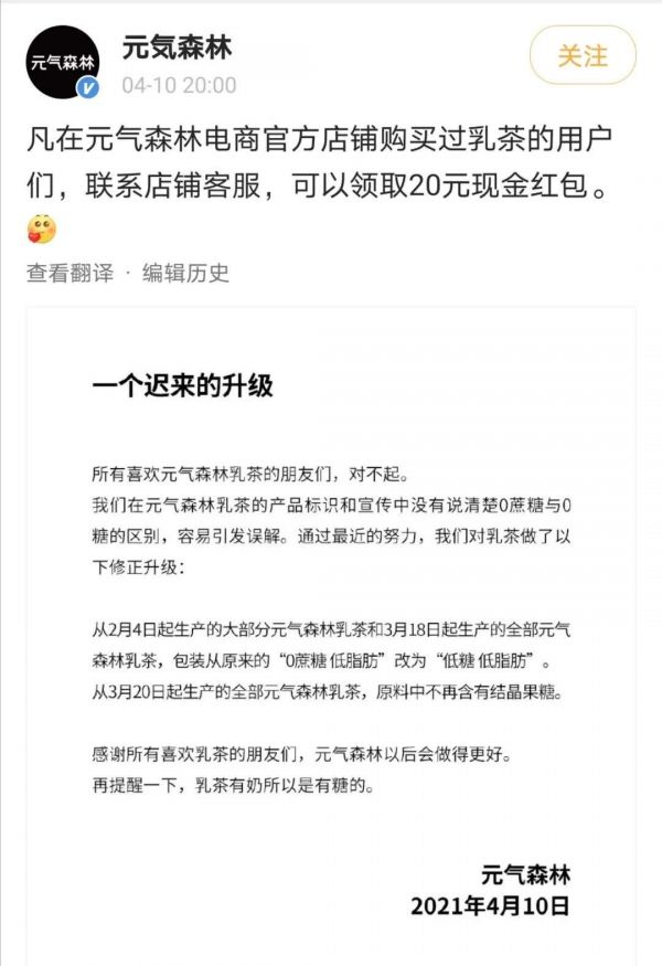 4月10日,这两年最火的网红饮料元气森林道歉了。