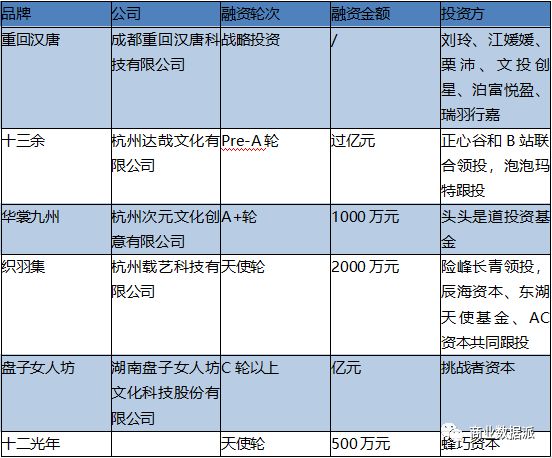 这笔投融资中的三大主角分别是:B站、泡泡玛特、汉服,堪称当下“年轻人的三件套”。相比二次元和盲盒,汉服圈如今还没能产生代表性上市公司,放眼全网超千家店铺,获资本青眼只有重回汉唐、十三余、华裳九州和织羽集等少数几个品牌,即便加上有汉服元素的国风摄影品牌“盘子女人坊”和次元少女馆“十二光年”,出挑的公司也不超过十家,且其整体融资规模、轮次也都集中在早期阶段。