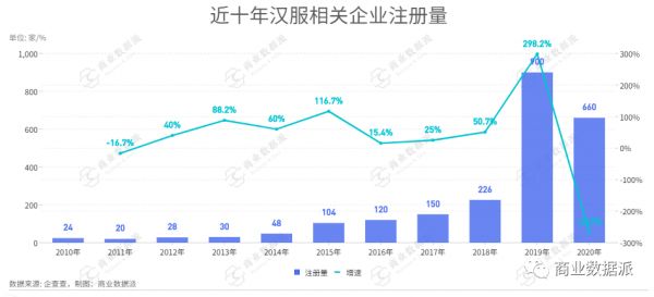 据央视财经频道2019年9月报道,当时全国汉服市场消费人群超过200万,产业规模约10.9亿元,但这只是保守估计。据当年淘宝数据显示,仅淘宝平台的汉服成交额就超过20亿元。从国内这两年汉服相关企业的年注册量变化来看,虽然汉服经济增长的趋势依旧迅猛,但经过了2019年的暴涨高潮后,现下已经进入稳定收缩阶段。而在每年稳定增长的企业数量背后,是汉服经济日益完善的产业链。