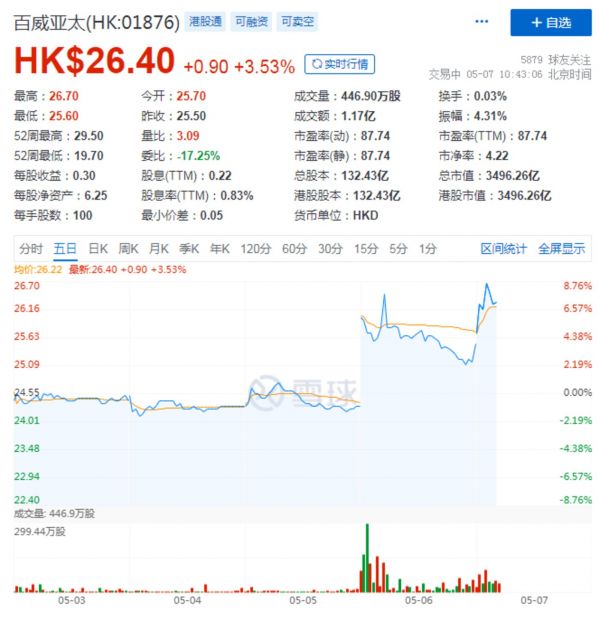 受财报利好的影响,投资者也给予了充分肯定,当日港股开盘,百威亚太股价走势平稳,涨幅一度超8.8%,截止当日收盘,百威亚太涨幅达1.96%。