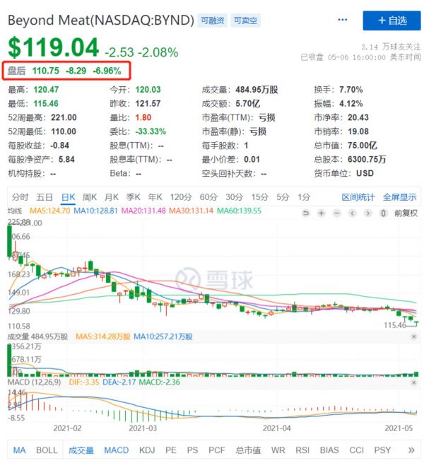 然而,营收只有11.42%的同比增长资本市场却并不买账,在财报公布后,Beyond Meat股价盘后更是收跌6.96%。