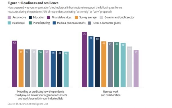 在定义决定整体抗震能力的关键因素(例如covid-19大流行)时,《经济学人》智库将重点放在组织技术基础设施的五个要素上:供应链调整、远程工作与协作、风险建模和预测分析、实时决策、员工安全监控。