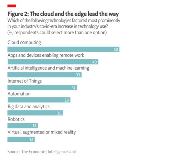 被调查者在他们的转型努力中应用了几个最突出的创新:云计算、远程协作工具、人工智能和机器学习、物联网技术(图2)。