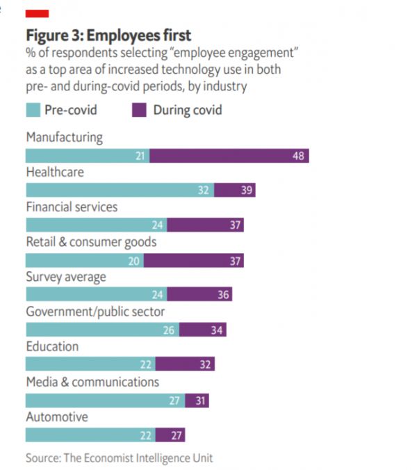 然而,大流行将员工的敬业度从一件好事提升到了重要优先事项的位置(图3),每个行业都把它作为技术使用增加的首要领域。随着世界各地的员工转向远程协作,公司被迫保持团队活力和积极的远程人际关系,同时也希望帮助员工保持工作效率和职业成长性。