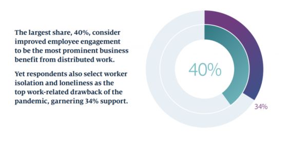 尽管员工在面对巨大压力时表现出了令人印象深刻的灵活性,但公司看到了向分布式工作转变的利弊。40%受访对象认为,提高的员工敬业度和经验是分布式工作所能带来的最主要商业利益,其次是「数字优先」的心态。
