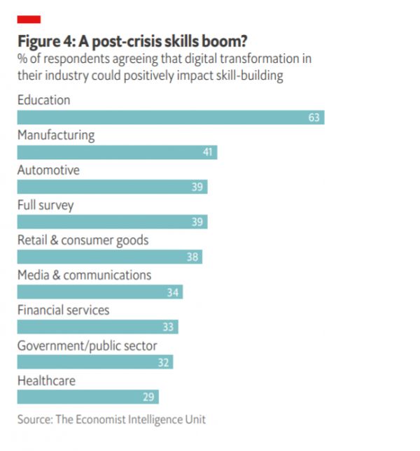 图4:教育、制造和汽车行业最倾向于认可数字化转型给人才技能培养带来积极效应。