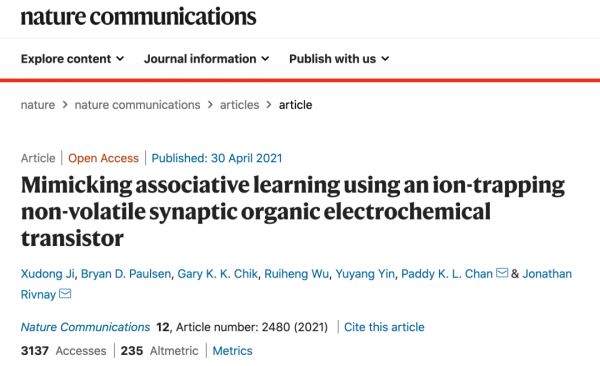 相关研究以 “Mimicking associative learning using an ion-trapping non-volatile synaptic organic electrochemical transistor” 为题,发表在科学期刊《自然通讯》(Nature Communications)上。