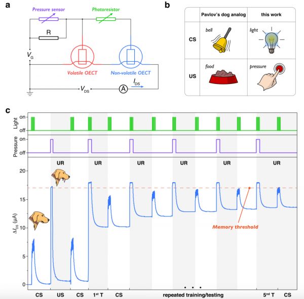 研究人员表示,该研究基于有机电化学晶体管的非易失性特点,已成功展示了一种神经形态电路,该电路可通过组合压力传感器、光敏电阻、易失性有机电化学晶体管和非易失性有机电化学晶体管,来模拟来自两个物理输入的联想学习。