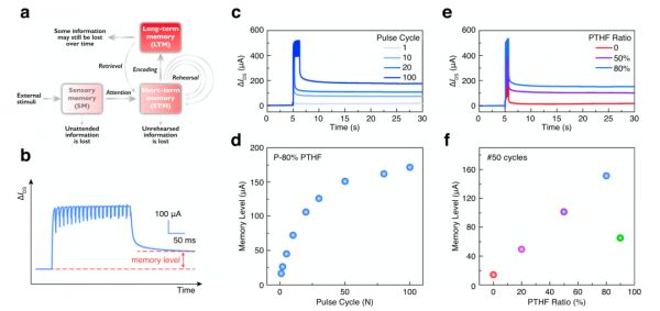研究人员分别用有机电化学晶体管模拟了突触的短期可塑性(STP)和长期可塑性(LTP)。STP 会发生突触权重的暂时性改变,而 LTP 通过更持久地改变突触权重来发挥其在记忆或学习中的作用,LTP 可以持续几分钟、几天甚至几年。在实验中,通过反复给有机电化学晶体管施加突触前栅极电压脉冲,研究人员模拟了大脑的记忆过程。