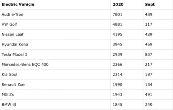 在挪威道路联合会(OFV)的发布的数据中,2020全年挪威本土共售出141,412台新乘用车,其中76,789台为纯电动车。大众旗下的奥迪e-tron销量排名第一,大众e-Golf、日产Leaf(聆风)排在其后,现代Kona电动版(昂希诺)和特斯拉Model3 分列第四和第五。