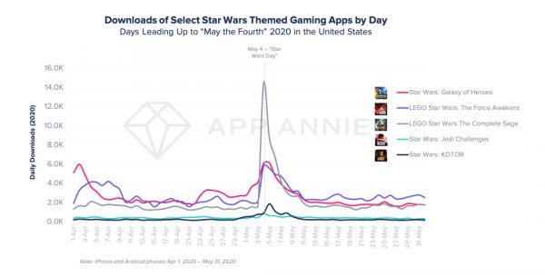 《星球大战》系列移动应用通常会在每年的 5 月 4 日之前出现下载量激增。尤其是在 2020 年 5月 4 日,《乐高星球大战:完整的传奇》( LEGO Star Wars: The Complete Saga )的下载量超过了 1.4 万次,而之前一周的平均每日下载量仅为 1400 次。《乐高星球大战:原力觉醒》(LEGO Star Wars: The Force Awakens)的下载量也增长了 190%,同样,《星球大战:银河英雄》(Star Wars: Galaxy of Heroes)在 5 月 4 日的下载量超过了过去两个月的任何一天。