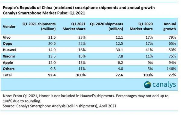 以2021年一季度为例,国产四家(华为、小米、OPPO、vivo)+美国一家(苹果)组成BIG5格局,在华为出现50%断崖式下滑的情况下,还是没有被打破,但是这种情况可能会因为其他因素,导致变化,最大的因素就是华为跌出前五。