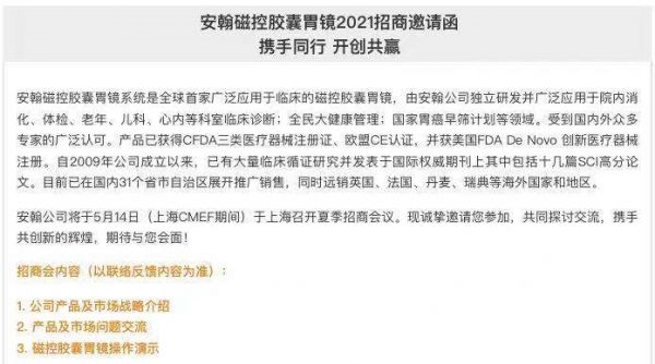 如果继续向前,安翰科技需要也必须甩开美年大健康的掣肘,进行更大规模的招商。2021年五月的CMEF期间,安翰科技计划举办招商会。但是发明专利仍然处于官司当中,依然备受质疑的安翰科技,这场招商会能否成功,依然需要时间来验证,相信在短期内安翰科技很难获得更大的市场份额。