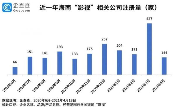 “头部能来的都来了,小公司也来了”,一名驻扎在海南的导演告诉深燃。和王飞情况相似的影视行业从业者还有很多,根据企查查数据,自2020年6月《海南自由贸易港建设总体方案》发布以来,截至2021年4月13日,海南新增注册“影视”相关公司已达2062家。在过去一年里,海南平均每月新增影视相关公司近200家,2021年3月更是高达427家。