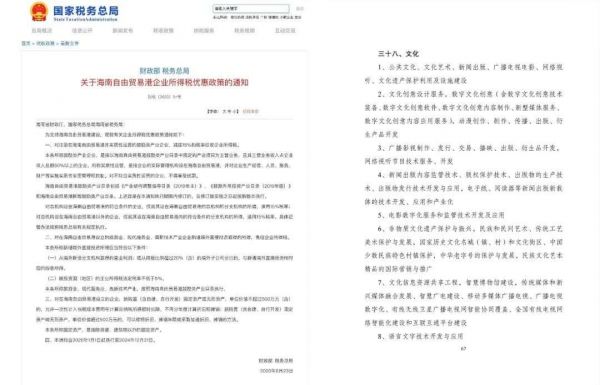 左为海南自由贸易港企业所得税优惠政策通知,右为《产业结构调整指导目录(2019年本)》部分内容,囊括范围包含影视行业