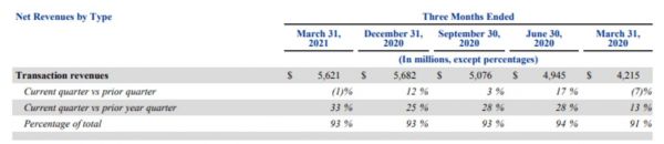长期以来,PayPal主要营收来自交易收入,以Q1财报公布的数据为例,其交易营收为56亿美元左右,较60亿美元的总营收,占比高达93%,可以说交易完全是PayPal的基本盘。尤其是PayPal的履历背靠eBay,与阿里巴巴之类的全球性电商巨头合作密切,其主要业务支撑非常稳定。