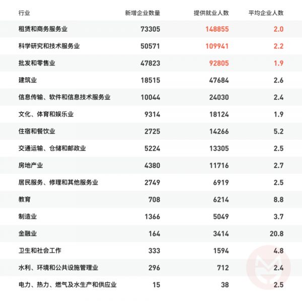 除了存量,我们还需要考虑增长,如果我们将样本中2019年新成立的企业单独拿出来进行分析,会发现新生企业的员工人数规模小于全样本平均水平,除金融业外,其它行业平均人数都在10人以下,新生的企业有更大可能是小微企业。作为上海就业支柱产业的租赁和商务服务业、批发和零售业以及科学研究和技术服务业不仅在总就业中贡献了相当高的比例,而且在2019年新增企业提供的就业岗位中占到了近70%,同时这三个行业的平均人数仍然属于各行业中相对较小的几个。