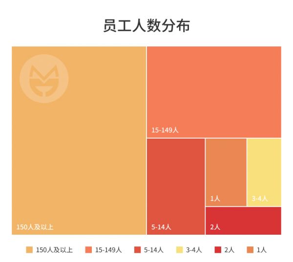 而不难发现,在这127.3万家企业中,不同规模的企业数量高度极化分布。有半数左右的企业,老板是“光杆司令”,还有五分之一左右的企业是“夫妻店”,仅有2名从业人员。虽然官方文件中对小微企业的定义不仅规定了从业人数,也有营收方面的指标,且不同行业的标准也各有不同,但总体上,小微企业的规模大多在20人以下。所以在我们的数据集中,如果用小于20人作为小微企业的划定标准,那么有95%的企业属于小微企业,而大中型企业全部加起来占到企业总数的不到5%。